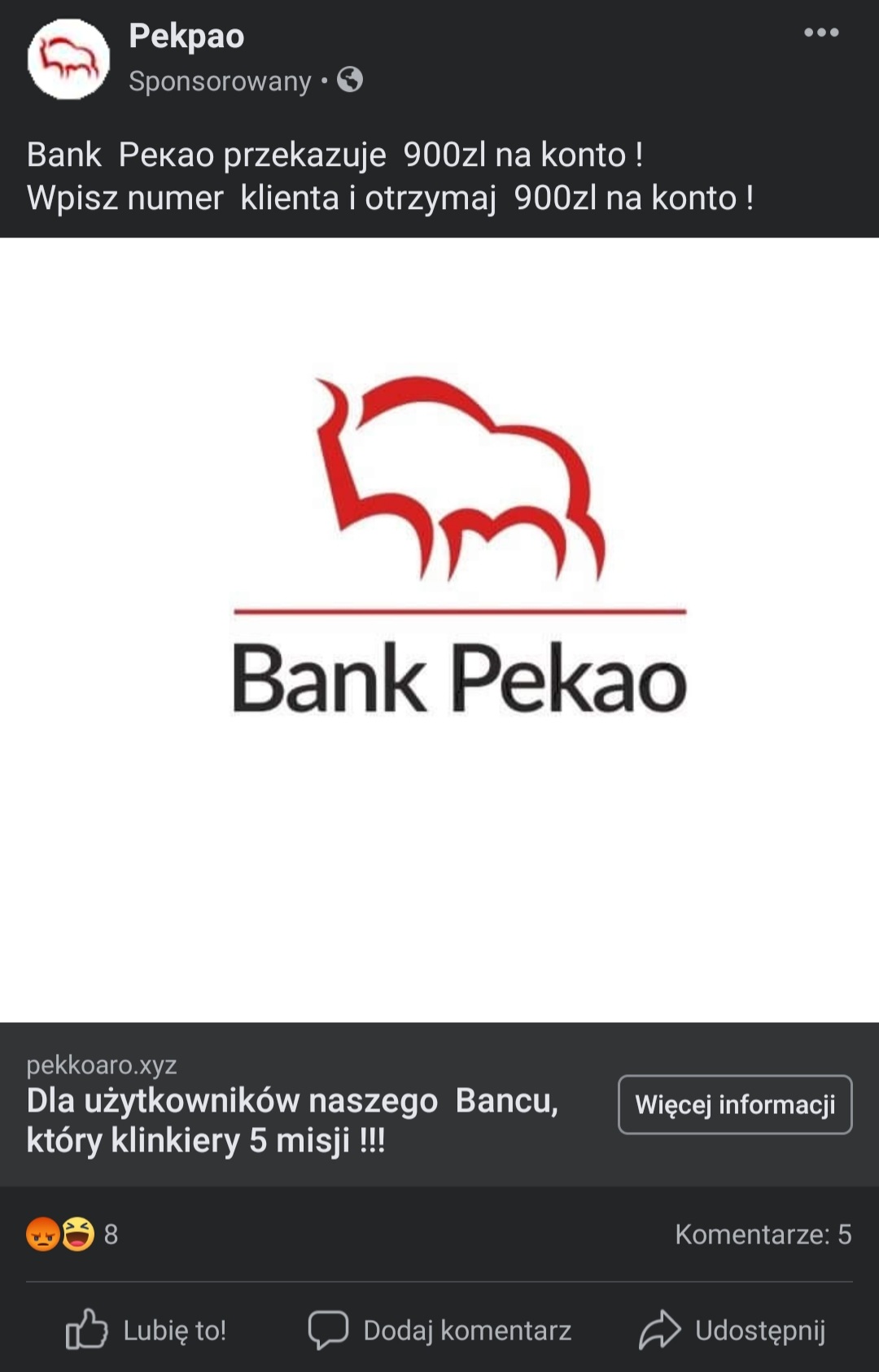 Nasi eksperci przechwycili nową pułapkę, zastawioną przez cyberprzestępców na użytkowników Facebooka. Pułapka wykorzystuje markę i identyfikację graficzną Banku Pekao, kusząc możliwością otrzymania 900 zł na konto bankowe. Popularny bank nie ma z nią jednak nic wspólnego. To kolejna odmiana oszustwa, wabiącego internautów fikcyjnymi nagrodami przyznawanymi rzekomo przez znane marki handlowe. Ostrzeż przyjaciół, to pułapka nastawiona na pozyskanie danych użytkowników sieci.