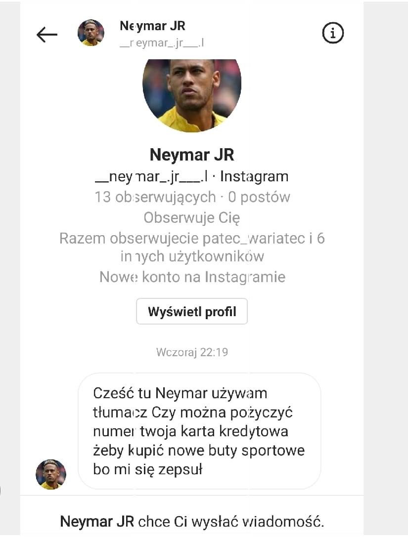 Cześć tu Neymar używam tłumacz Czy można pożyczyć numer twoja karta kredytowa żeby kupić nowe buty sportowe bo mi się zepsuły [pisownia oryginalna]. Trzymacie się jeszcze krzeseł? Cel pułapki jest dość jasny – chodzi o kradzież środków z karty kredytowej, a także późniejsze jej wykorzystanie np. do kolejnych zakupów w sieci. Problem w tym, że wiadomość dostajemy od rzekomego „Króla Paryża” czyli Neymara Jr. Nie jest to jednak prawdziwe konto Instagramowe wskazanego piłkarza.